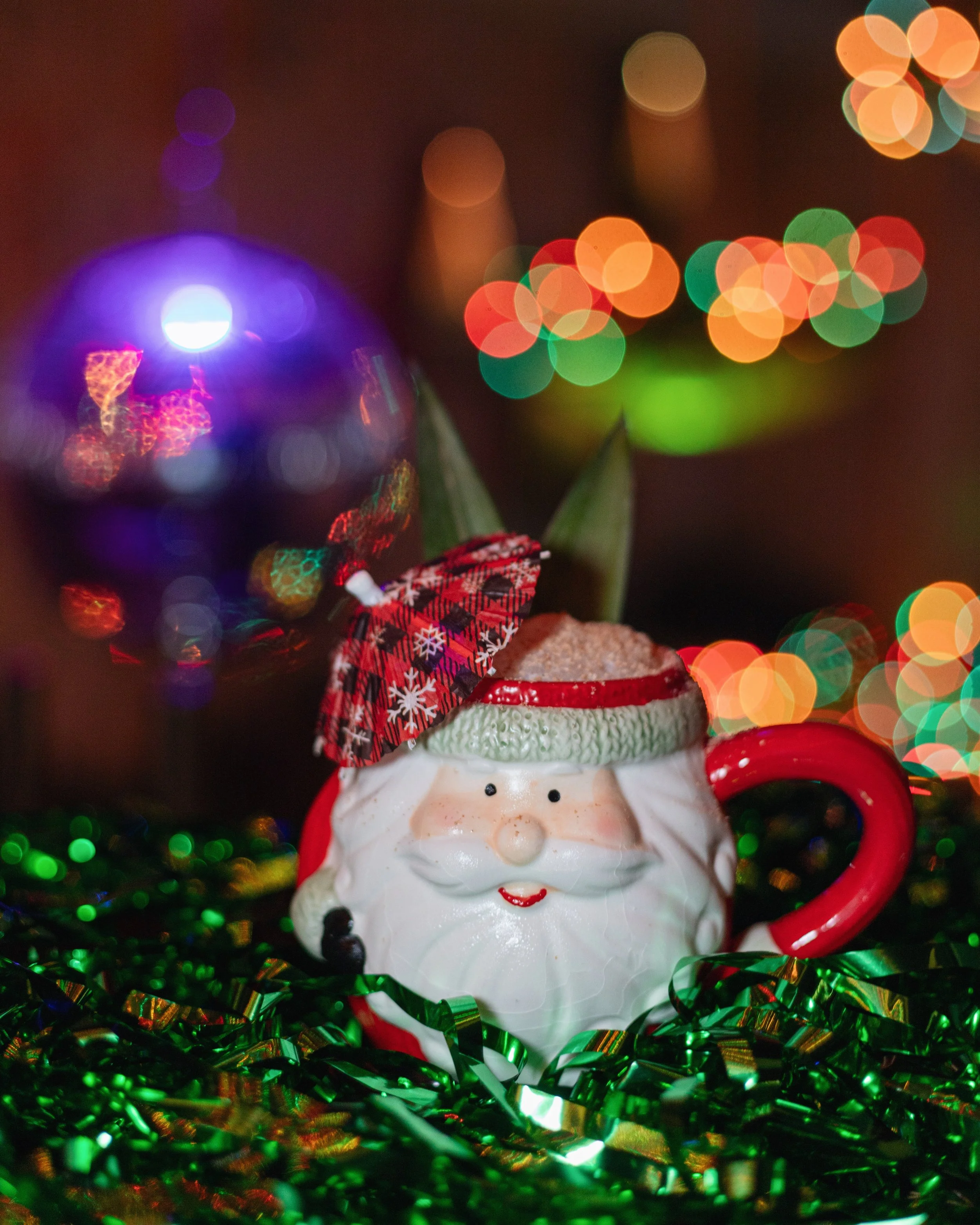 A ceramic Santa Claus mug with a jolly face, a red handle, and a decorative hat, surrounded by shiny green decorative tinsel and a blurred background of colorful bokeh Christmas lights.