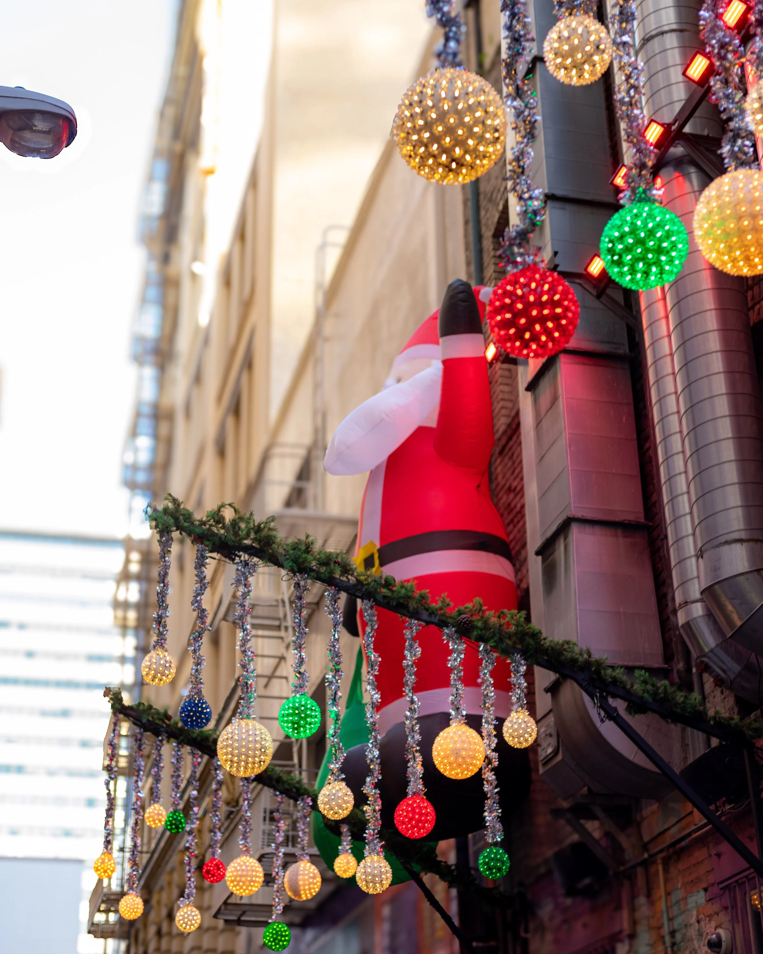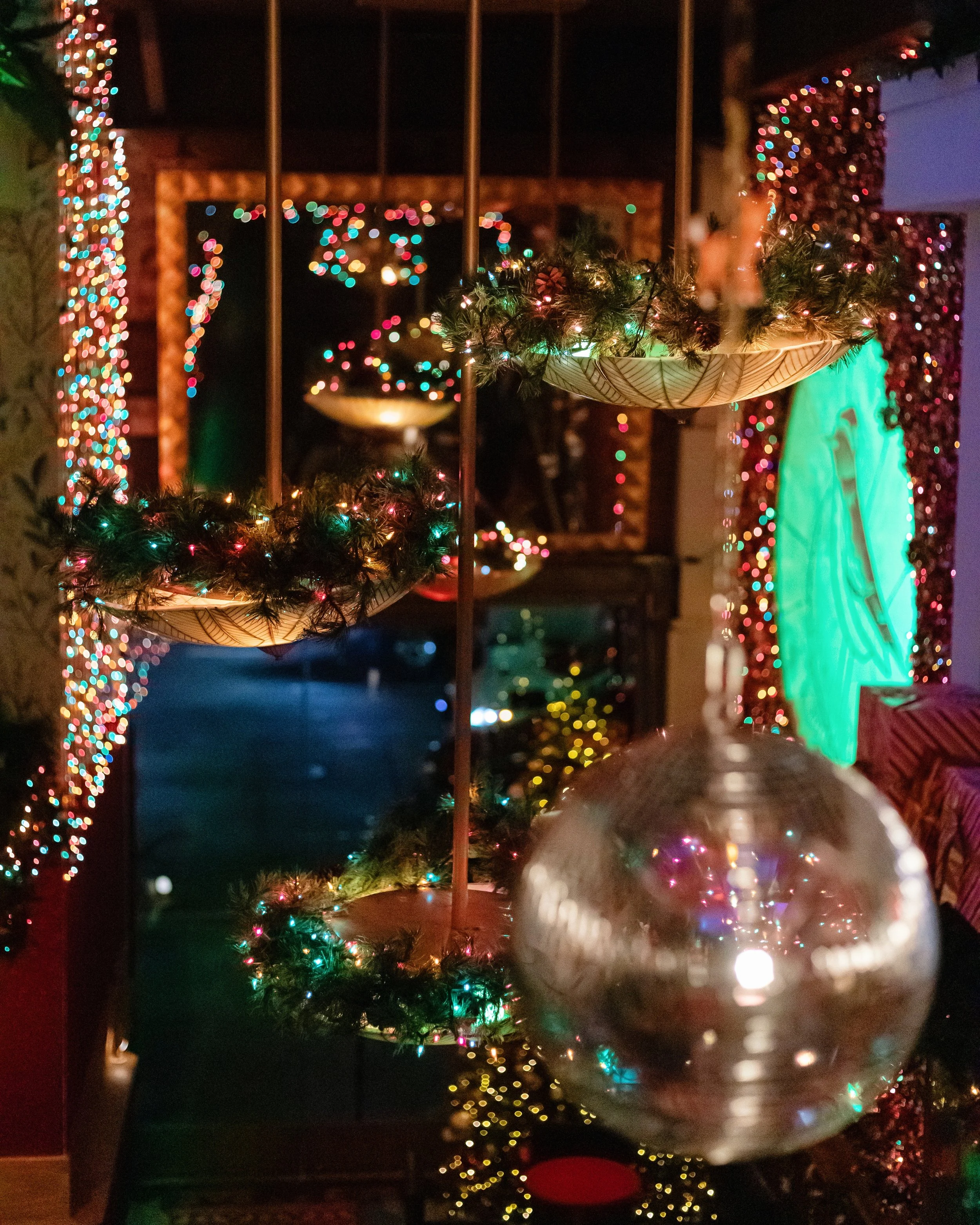 Christmas decorations with colorful string lights, hanging ornaments, and holiday greenery in a festive setting.
