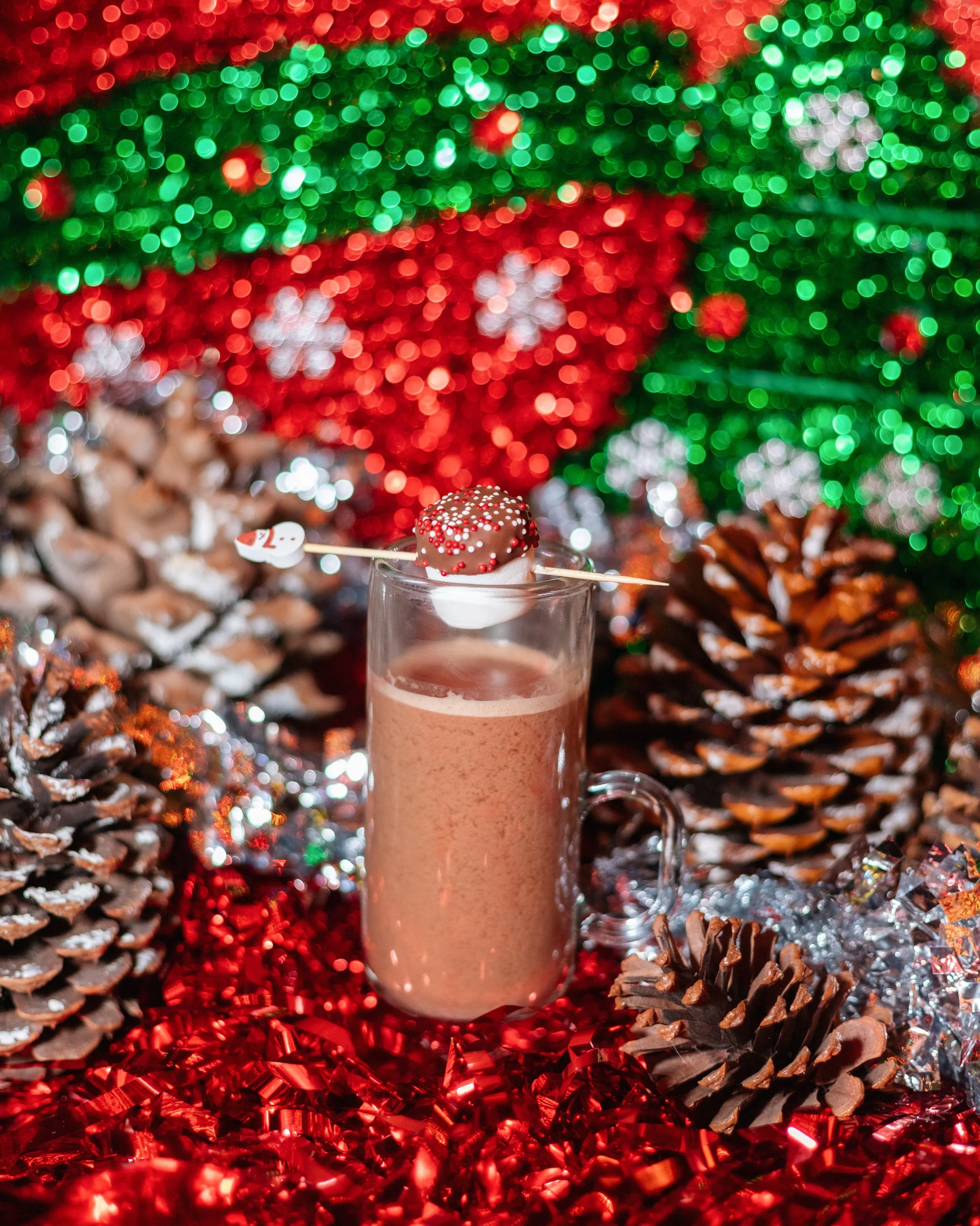 A festive Christmas scene with a tall glass of chocolate beverage topped with a mini marshmallow decorated with red and white sprinkles, surrounded by pinecones, red tinsel, and silver decorations, with a blurred background of red and green holiday l