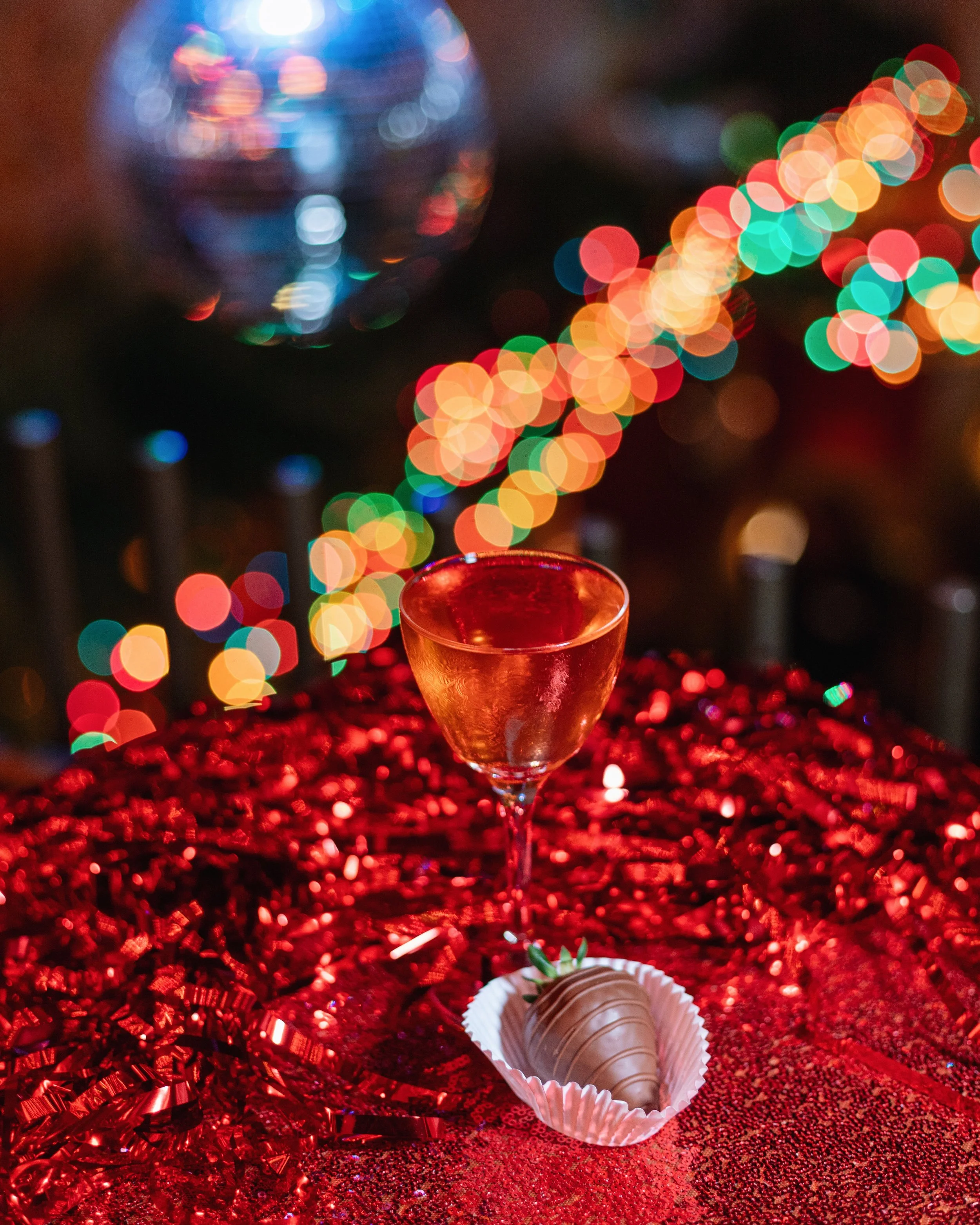 A red cocktail in a coupe glass sits on a sparkly red tablecloth, with a chocolate covered strawberry in a white paper cup nearby, in a festive setting with colorful blurred Christmas lights in the background.