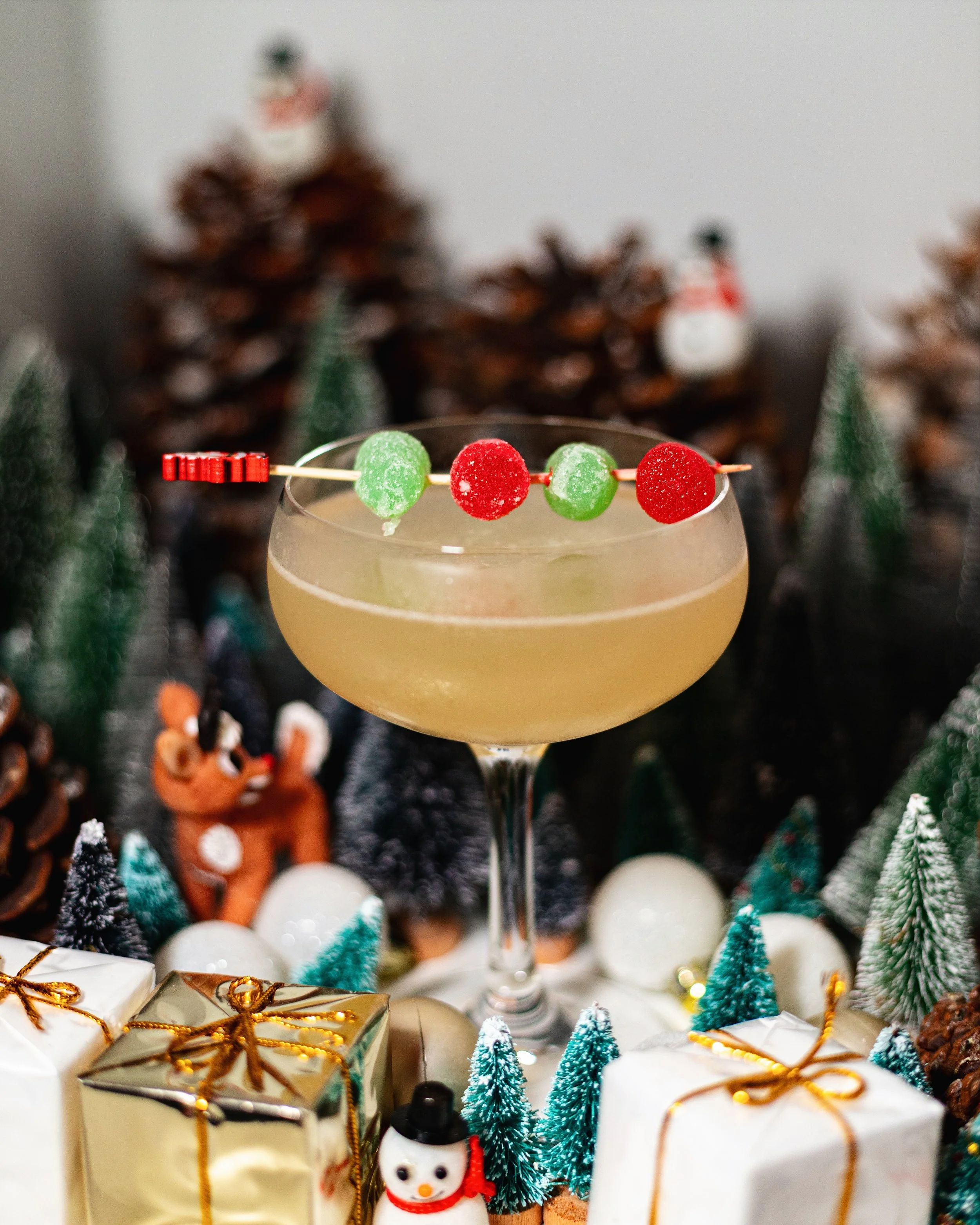 A holiday-themed cocktail in a coupe glass garnished with red and green gummy candies on a skewer, surrounded by miniature Christmas trees, wrapped presents, and holiday decorations including a small snowman figure, pinecones, and a reindeer figurine