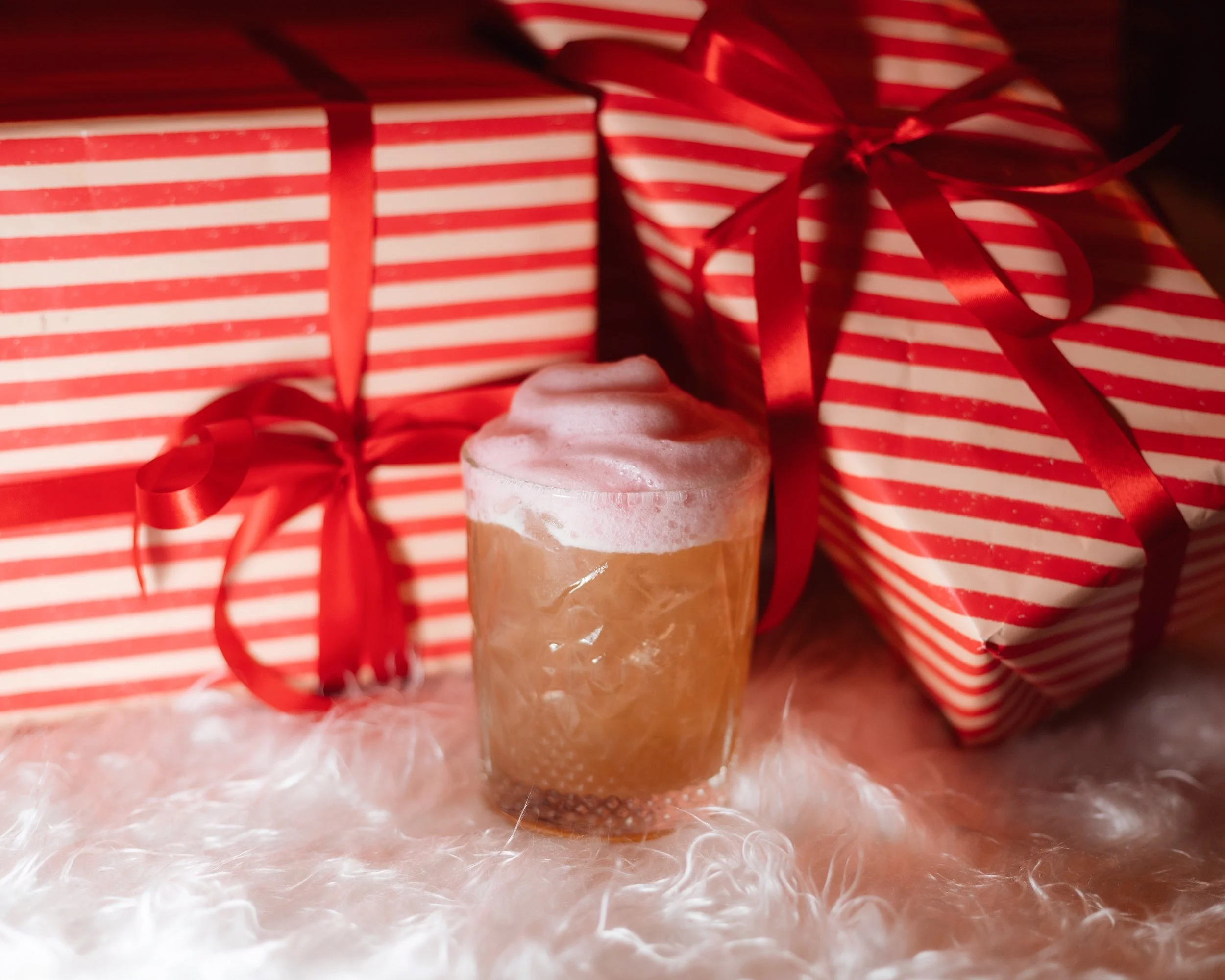 A glass of beer with foam on top, surrounded by wrapped Christmas presents with red and white striped paper and red ribbons