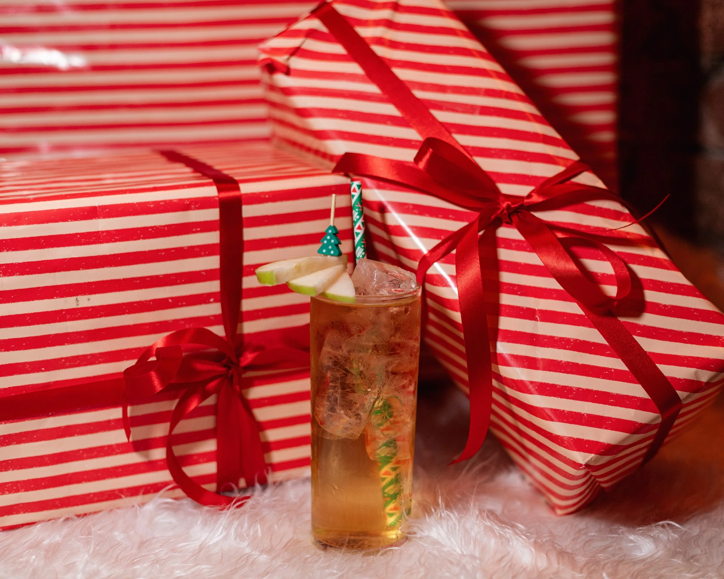 A Christmas scene with red and white striped wrapped presents with red ribbons and bows, a glass of a beverage with ice, lime wedges, and holiday-themed decorations like a small Christmas tree and a straw, on a fluffy white surface.